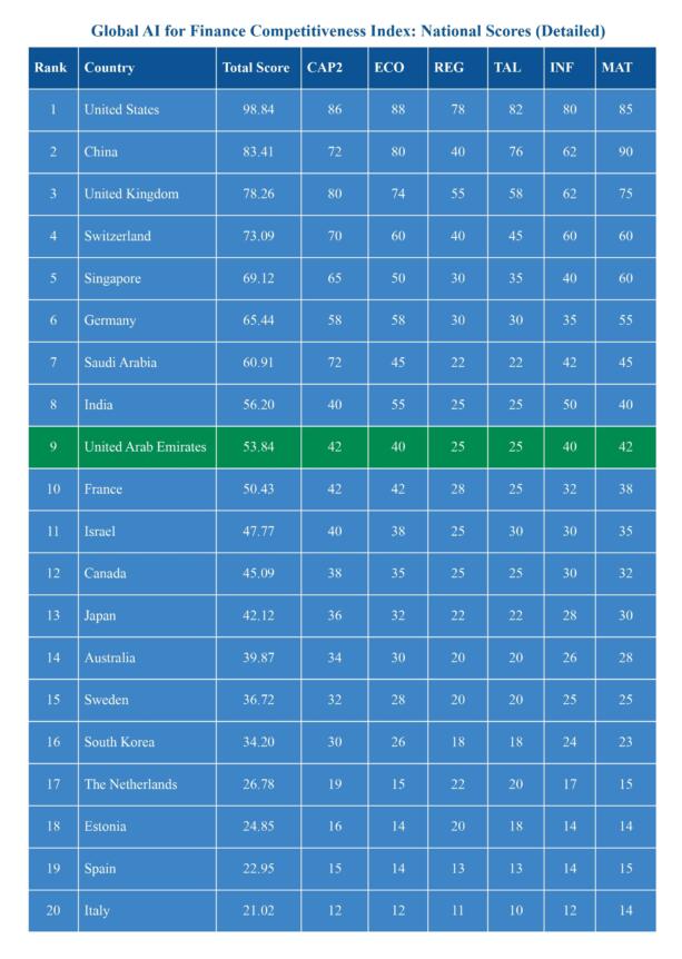Os Emirados Árabes Unidos destacam-se não apenas por sua capacidade tecnológica, mas também por sua capacidade de transformar o potencial da IA em sistemas financeiros operacionais. Esta combinação única de desenvolvimento de IA impulsionado pelo Estado, um ecossistema financeiro voltado globalmente e uma execução institucional robusta torna os Emirados Árabes Unidos um líder na implantação de IA em mercados financeiros regulamentados. Como um "construtor de sistemas", os Emirados Árabes Unidos competem não pelo volume puro de produção de pesquisa, mas pela velocidade de adoção de IA, modernização regulatória e caminhos de implantação eficientes. Sua capacidade de implementar rapidamente programas de IA, estabelecer quadros regulatórios claros e escalar ferramentas financeiras impulsionadas pela IA posicionou o país como um laboratório global para IA de nível financeiro.