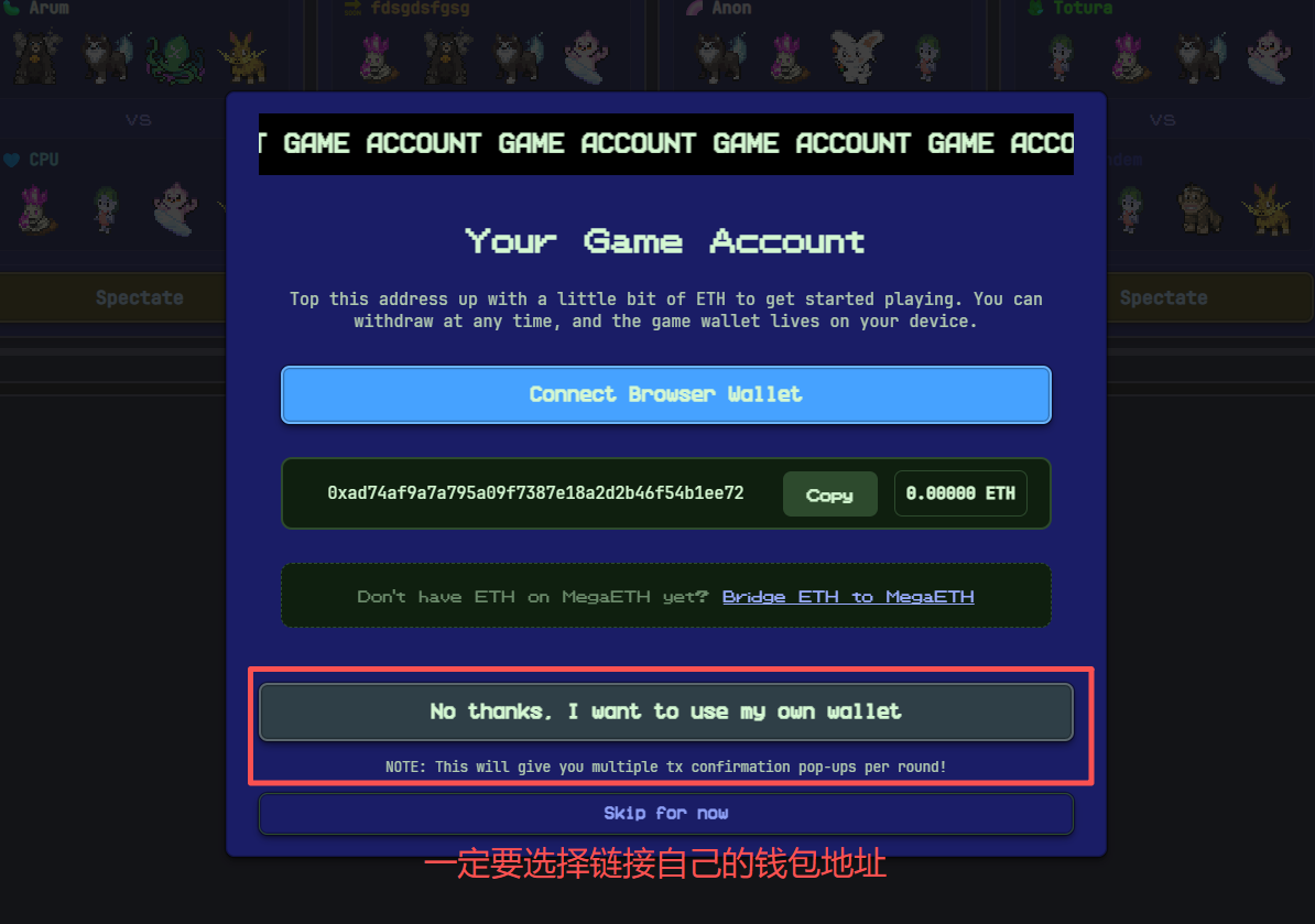 1) Entrar no jogo -- definir nome de utilizador -- escolher utilizar o endereço da carteira própria