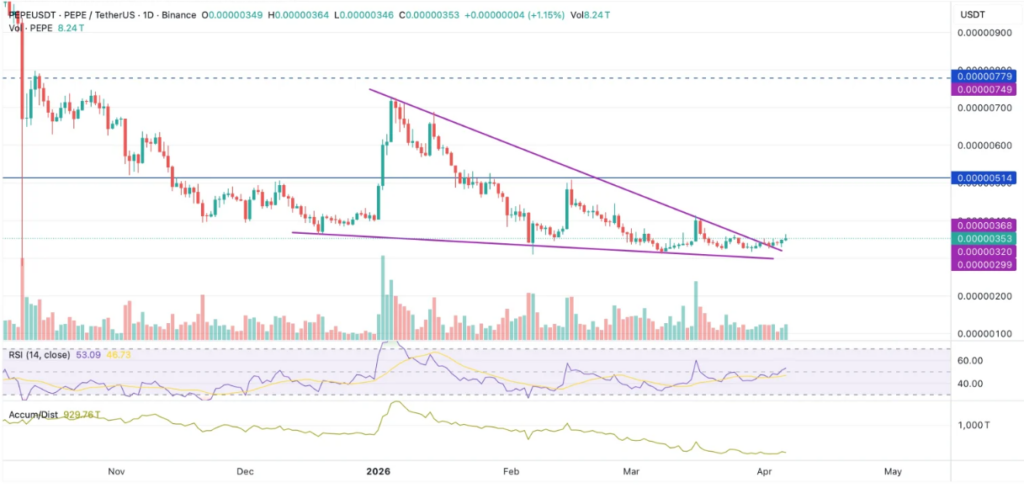 O preço do Pepe se estabilizou após meses de queda, mostrando sinais de resiliência na faixa de $0,0000029 a $0,0000032. Além disso, o token registrou alta diária de quase seis por cento, enquanto o volume de negociação aumentou acentuadamente, indicando atividade renovada. No entanto, a estrutura mais ampla ainda reflete pressão de uma linha de tendência descendente que continua a limitar os movimentos de alta.