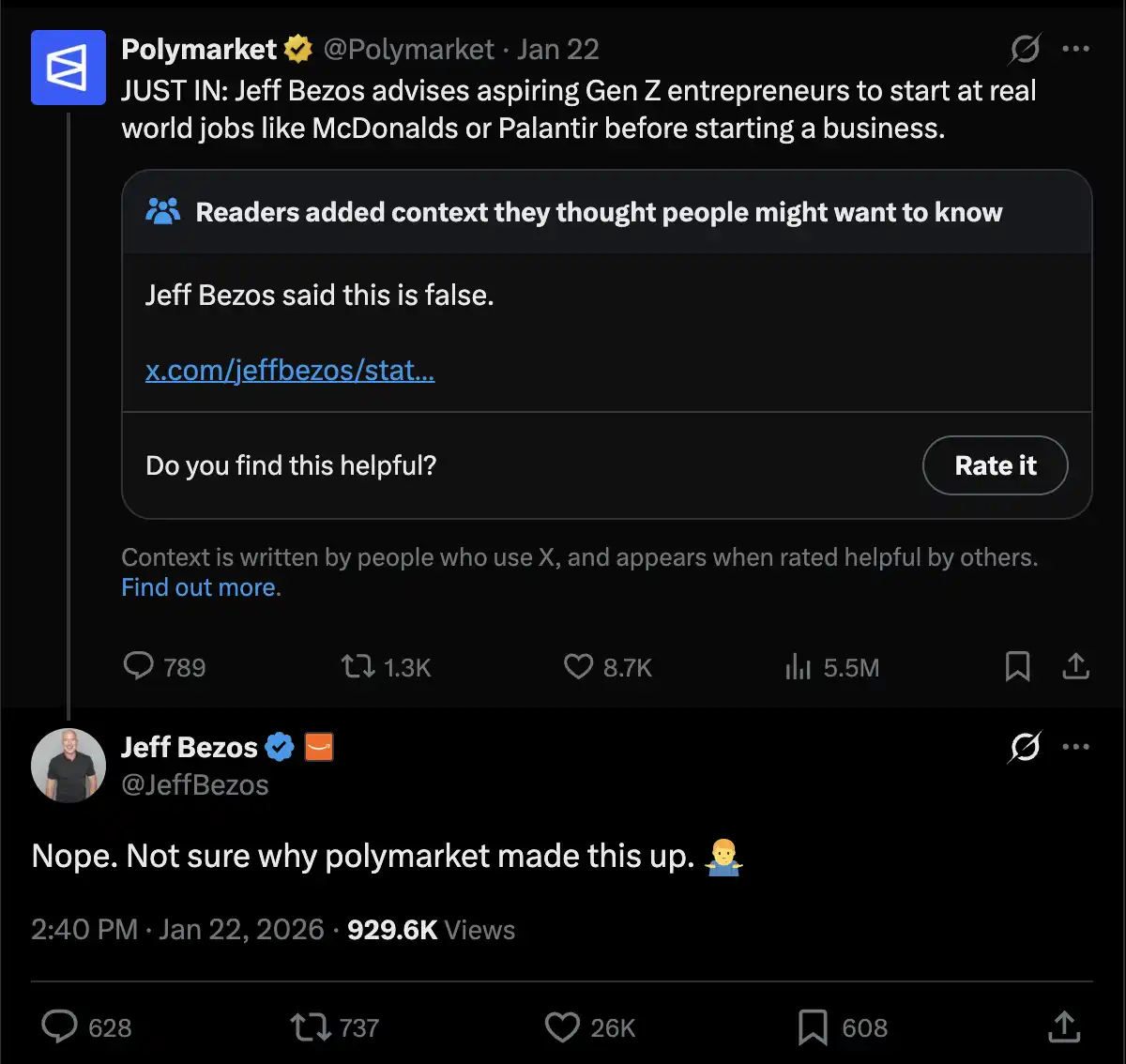 Uma forma que eles encontraram para “aumentar o alcance” é fazer notícias no X. Nos últimos meses, as contas oficiais da Polymarket e da Kalshi entraram em confronto direto na linha do tempo, competindo por visibilidade com títulos curtos e impactantes e citações de celebridades — às vezes até ignorando a precisão ou outros princípios. Recentemente, a Polymarket erroneamente atribuiu uma frase a Jeff Bezos e exagerou drasticamente os dados de deportação; já a Kalshi espalhou afirmações falsas sobre negociações para comprar a Gronelândia.