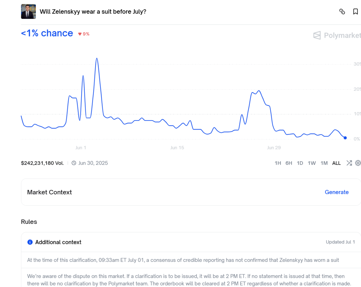Na realidade, em junho do ano passado, Zelensky usou um fato formal num evento público, e interpretações de várias partes, incluindo a BBC e designers, confirmaram que se tratava de um fato. Pelo senso comum, o assunto deveria estar resolvido. No entanto, na Polymarket, este fato aparentemente claro transformou-se numa batalha prolongada envolvendo centenas de milhões de dólares.