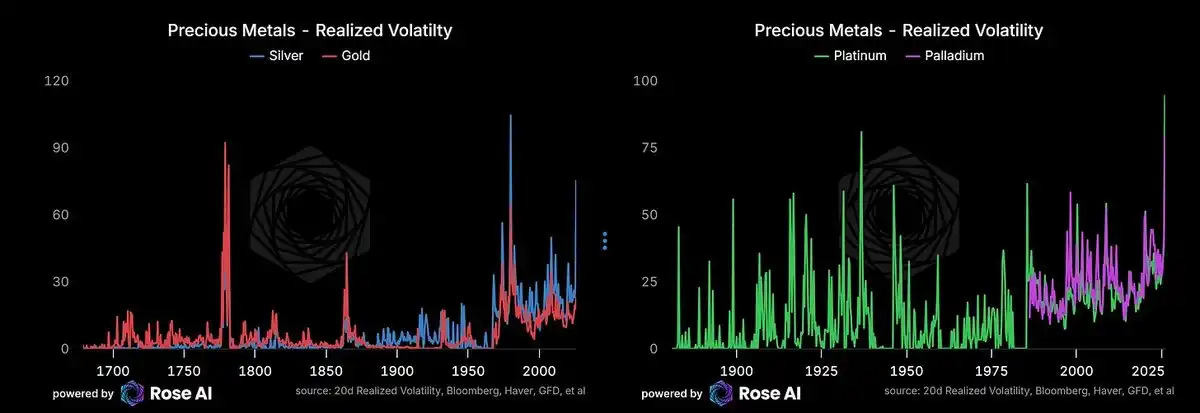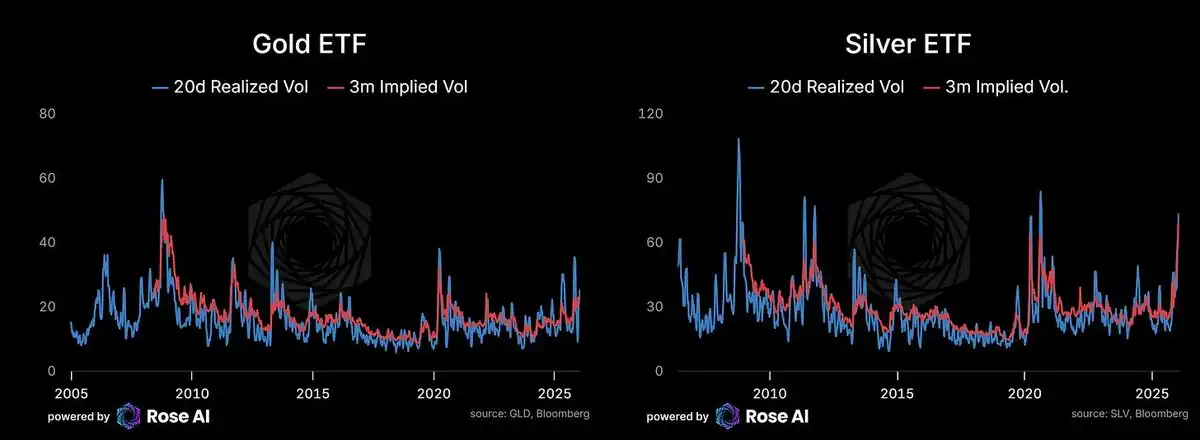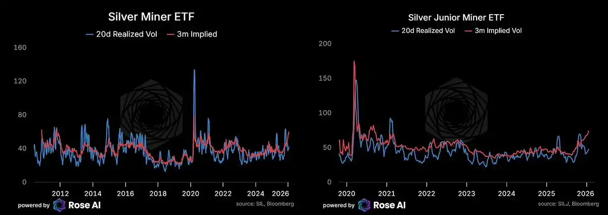 O mercado de opções está a prestar preços a uma volatilidade diária superior a 4% nos próximos meses, mantendo-se em torno de 3% no futuro previsível. Isto já foi confirmado pela volatilidade efectivamente verificada. Na história documentada, só houve duas ocasiões em que a volatilidade do prata foi mais elevada: durante a manipulação e o "squeeze" efectuado pelos irmãos Hunt em 1981, e durante a Guerra da Independência dos Estados Unidos (quando a volatilidade resultava do colapso da moeda local face à libra esterlina, e não da variação do próprio metal).