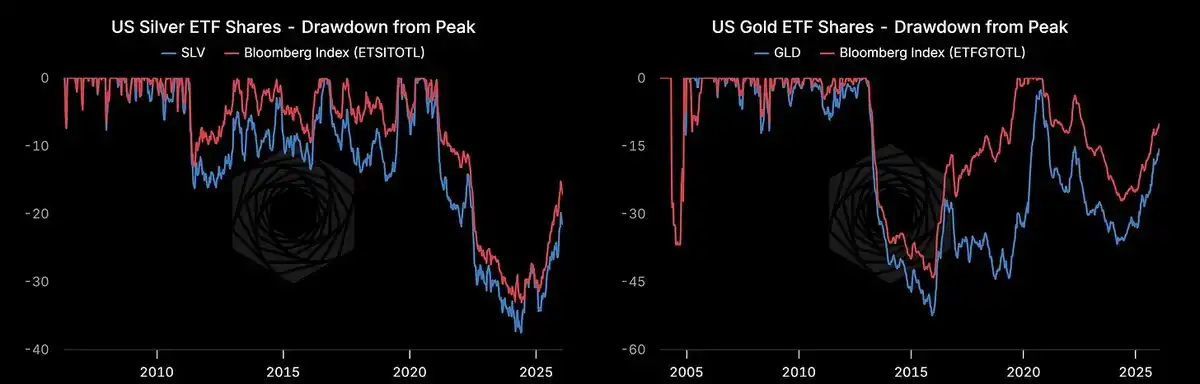 As cotas do ETF de prata dos EUA estão a aumentar, mas ainda estão cerca de 20% abaixo do pico de 2021. Ainda não atingimos o estágio de euforia.