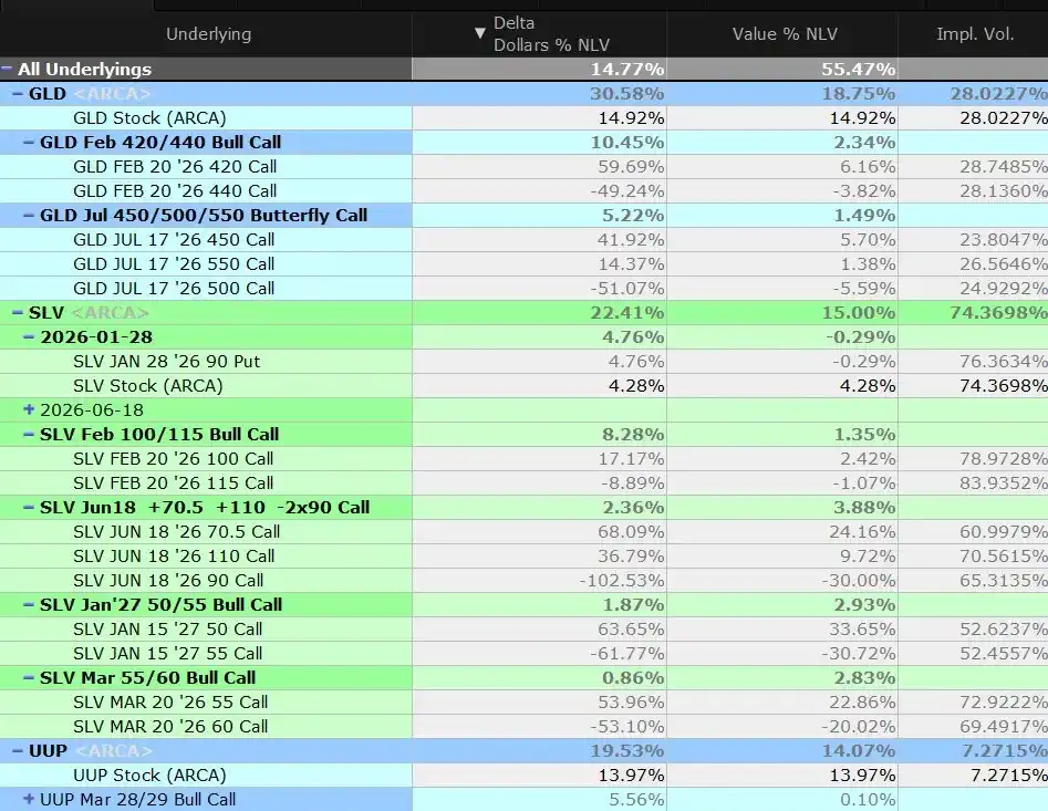 Em resumo: reconfigurámos o ouro e encerrámos ligeiramente mais da metade das posições de arbitragem de borboleta, na semana passada, quando o preço à vista ultrapassou o preço de exercício central. Actualmente, mantemos ainda uma posição longa.