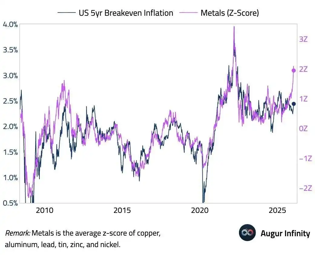 Dólar forte + preços elevados = pânico entre investidores com posições frágeis. Aqueles que perseguiram posições especulativas acima dos 100 dólares são diferentes das famílias chinesas que começaram a acumular desde os 30 dólares. Investidores com posições frágeis tendem a abandonar o mercado e reconhecer perdas durante uma inversão violenta. Se o gráfico abaixo estiver correto, estamos a ver uma divergência extrema entre os preços dos metais e a inflação equilibrada. Isto pode ser alinhado novamente através de taxas de juro e dólar mais altos e preços dos metais em queda.