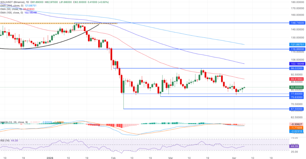 Na direção oposta, o Solana se mantém acima de uma faixa de suporte chave entre $75,63 e $77,60, o que ajudou a estabilizar a recente movimentação de preços. Essa zona atuou como base para o atual recuperação e pode limitar novas quedas se a pressão de venda retornar. Além disso, manter-se acima desse nível permanece importante para preservar a estrutura de recuperação em andamento.