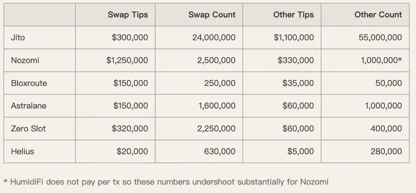 Entre eles, os serviços de implementação do Jito processaram 80 milhões de transações, dominando o mercado (93,5% de participação de mercado dos construtores). Dessas transações, a maioria é composta por swaps relacionados a transações, atualizações de oráculos e operações de market makers.