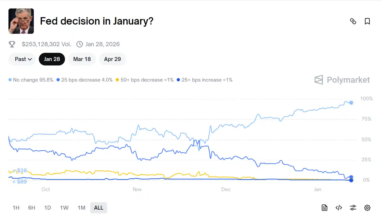 Os dados mais recentes do Polymarket mostram que a probabilidade do mercado apostar que a Fed manterá taxas estáveis em janeiro subiu para 96%.