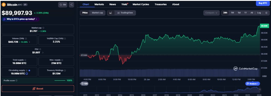 O preço do Bitcoin reagiu inicialmente de forma positiva à perspectiva de cortes mais profundos nas taxas, subindo brevemente acima de $89.000. No momento da redação, BTC negócios em torno de 90 mil dólares. Em contraste, o ouro subiu para um recorde de 5.200 dólares por onça enquanto traders recorreram a ativos mais seguros diante da incerteza da política.