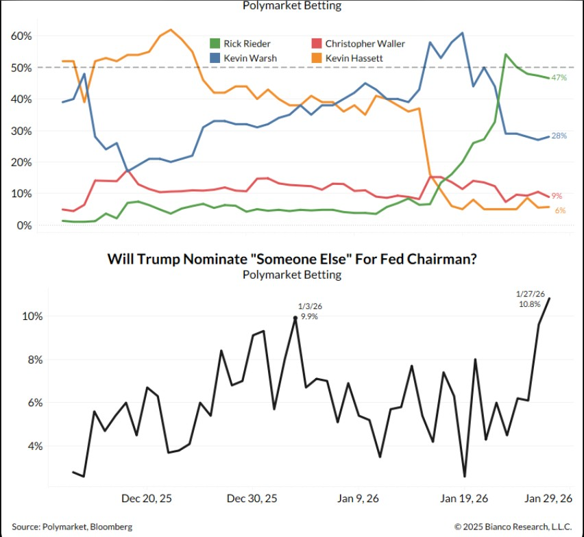 Rieder atualmente lidera nos mercados de previsão, com 48% de chances, segundo dados da Polymarket. Ele tem publicamente insinuado que o Fed pode reduzir as taxas em 100 pontos base em 2026, um movimento que se alinha à mensagem de Trump. Warsh segue com 25% de chance.