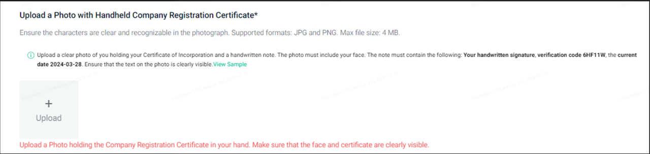 Faça upload de um autorretrato com você segurando o certificado de registro da sua empresa.