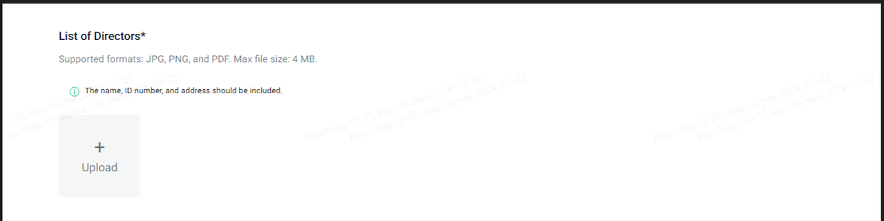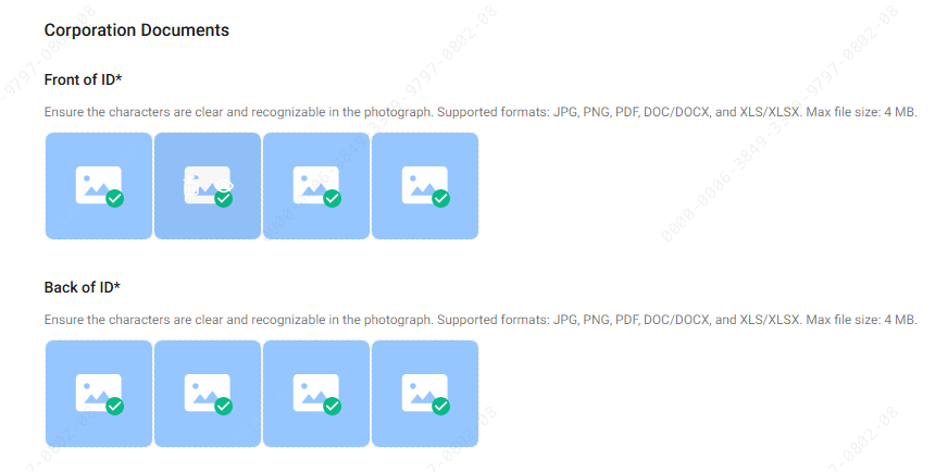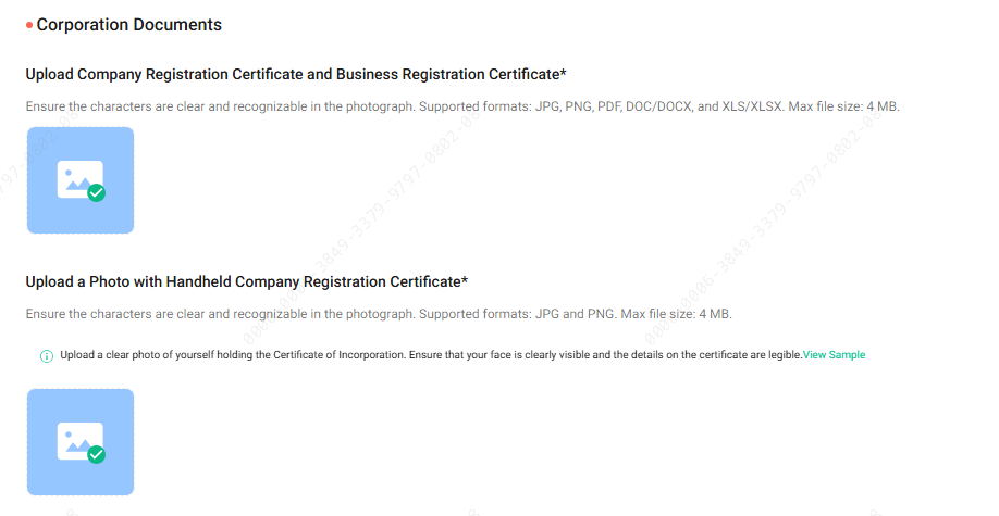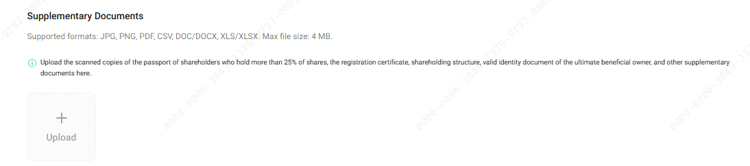 Carregue o certificado de registro da empresa ou o certificado de registro comercial. O documento deve ser claro e reconhecível.