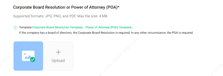 - Você pode usar nosso modelo fornecido para maior eficiência ou consultar um advogado para obter documentos personalizados, se necessário. Observe: Caso você opte por enviar uma deliberação do conselho ou procuração personalizada, poderá ser necessário mais tempo para análise e aprovação.