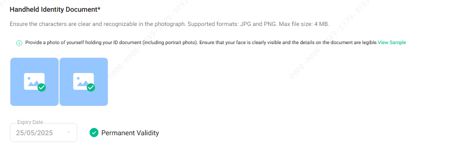 R: A data deve coincidir exatamente com o documento de identidade. Não selecione "validade permanente" se uma data de validade for especificada.