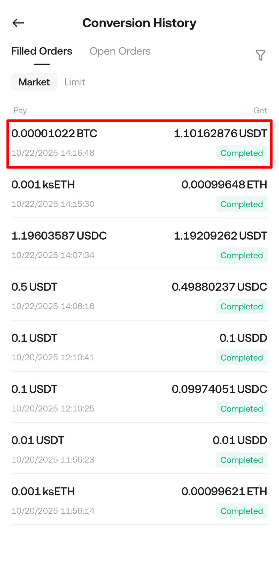 Na página de Converter, clique no ícone "Registro de Pedidos" no canto superior direito para ver a lista de registros de conversão. Selecione qualquer registro para ver seus detalhes