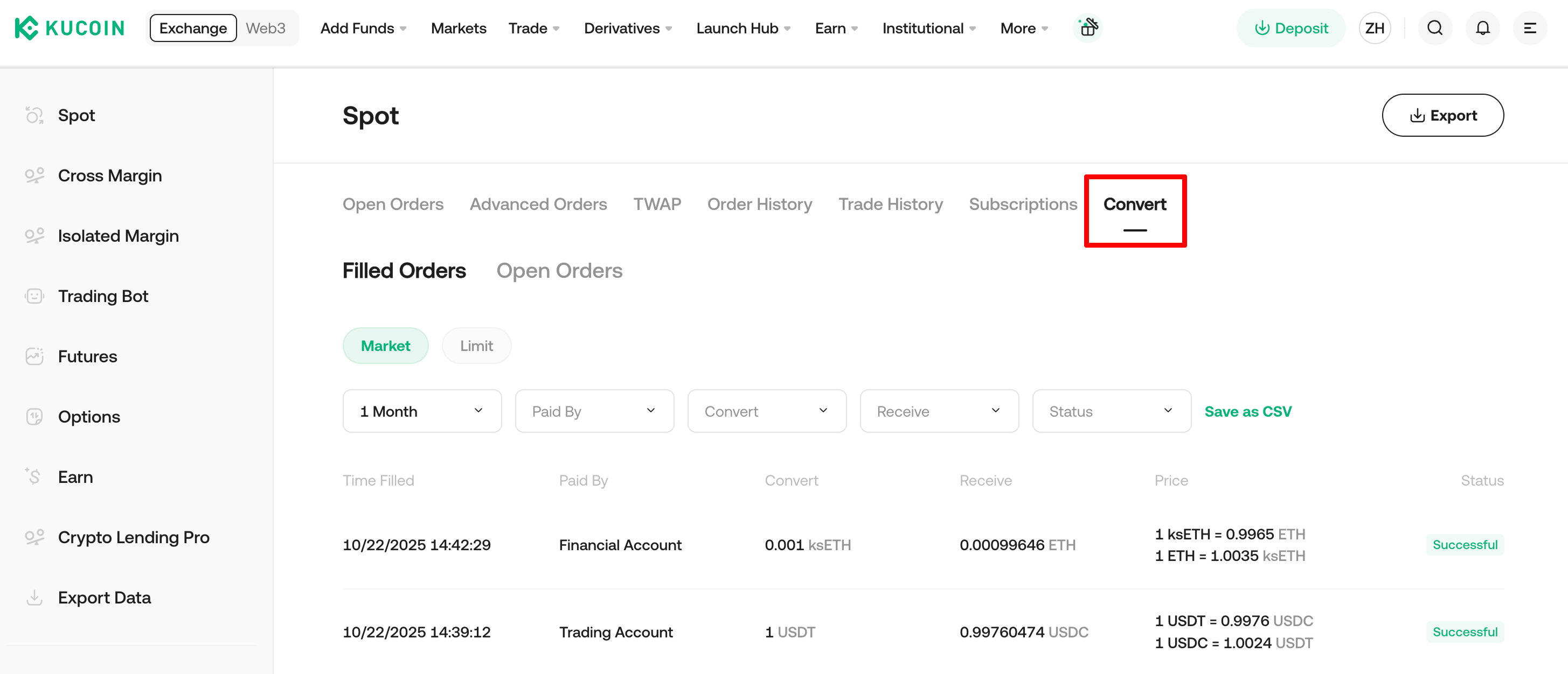 No site da KuCoin, selecione "Negociar" na barra de menu, depois escolha "Converter".