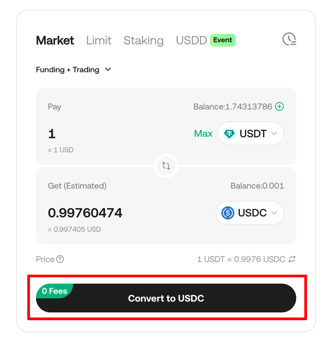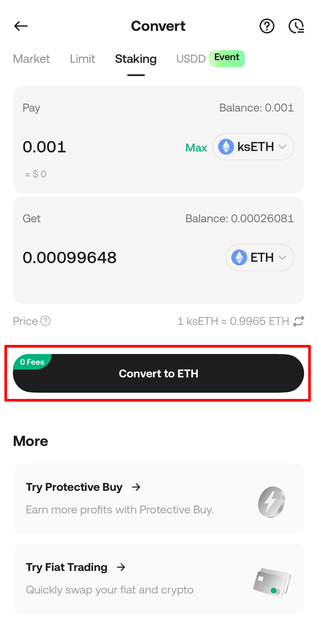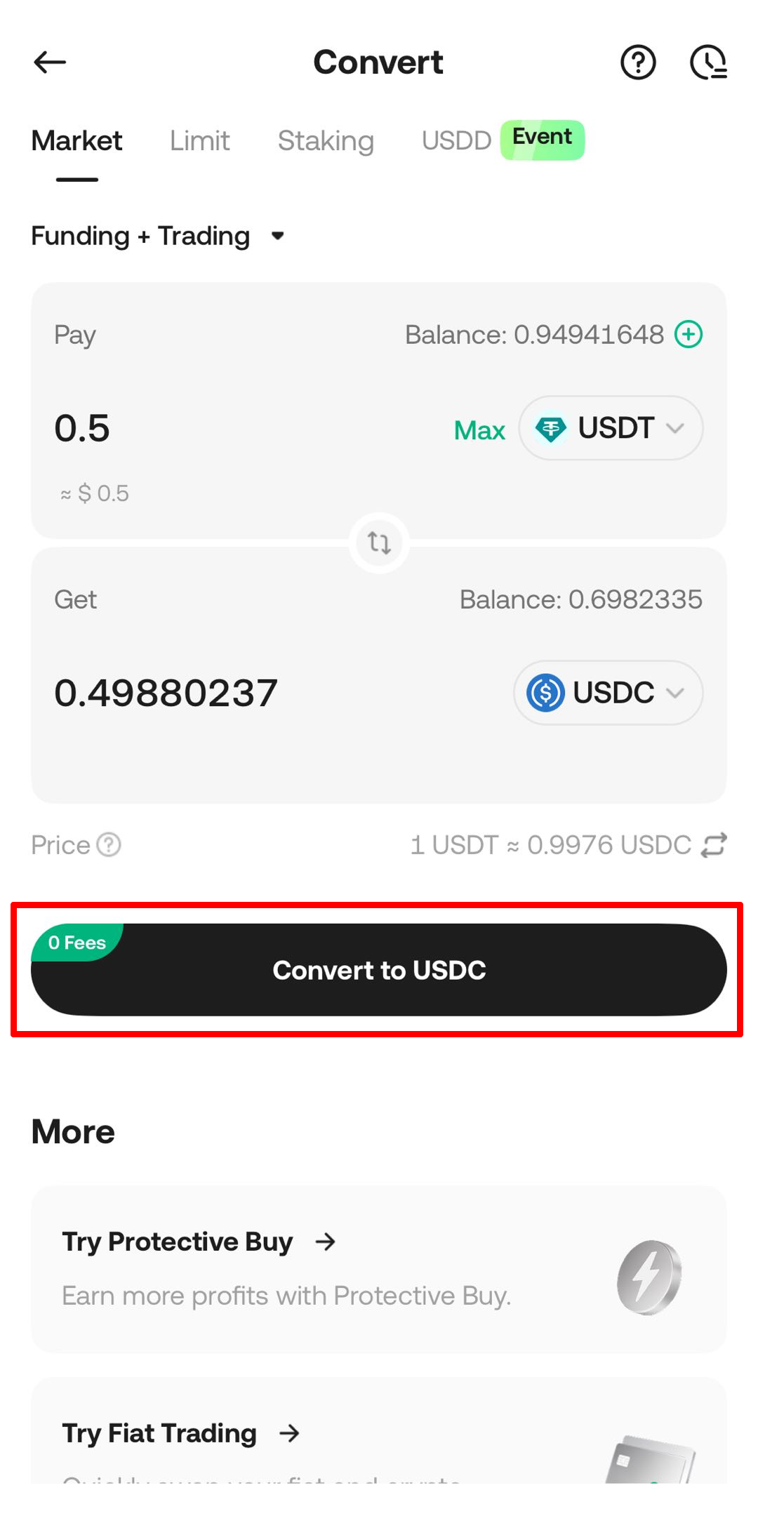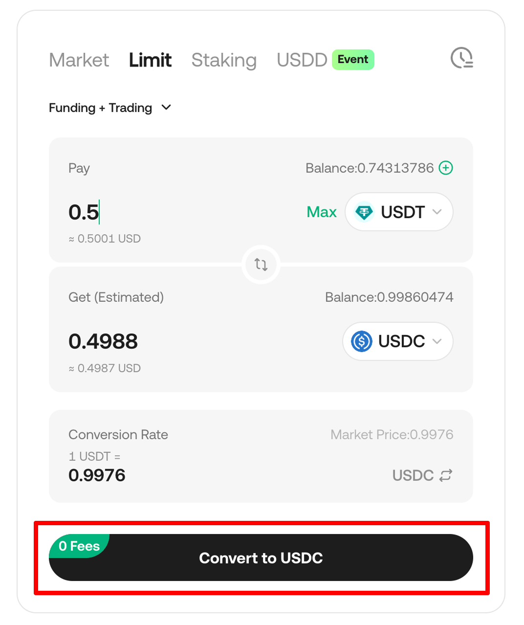 Na página de Conversão da KuCoin, selecione o modo de conversão na barra superior, incluindo Mercado, Limite e Staking.