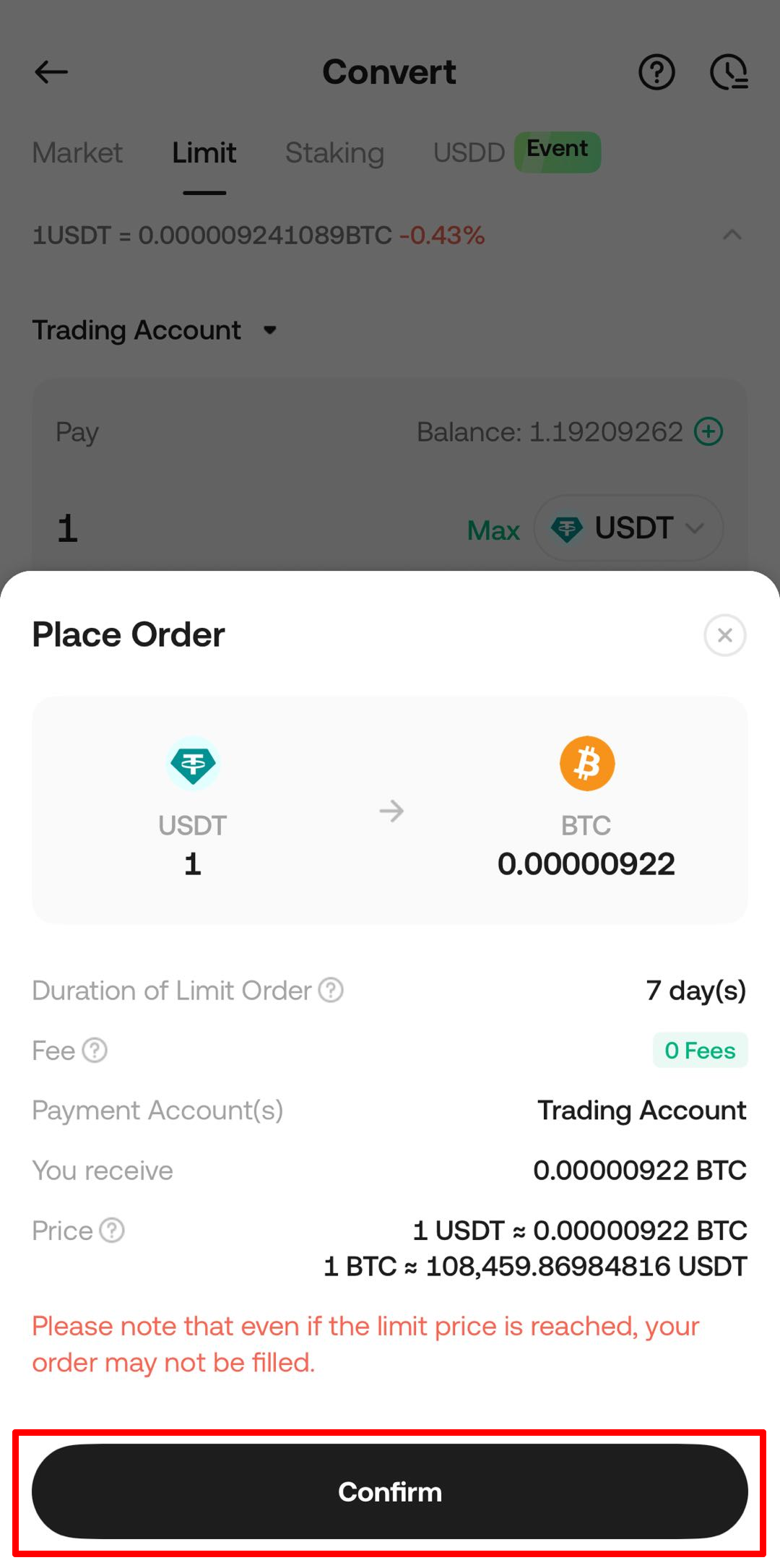 Após clicar em "Fazer Pedido", você pode revisar os detalhes do pedido (como valor, preço e período de validade) na tela de pré-visualização e confirmar o pedido. Por favor, note que mesmo que o preço de mercado atinja seu preço limite, seu pedido pode não ser preenchido imediatamente.