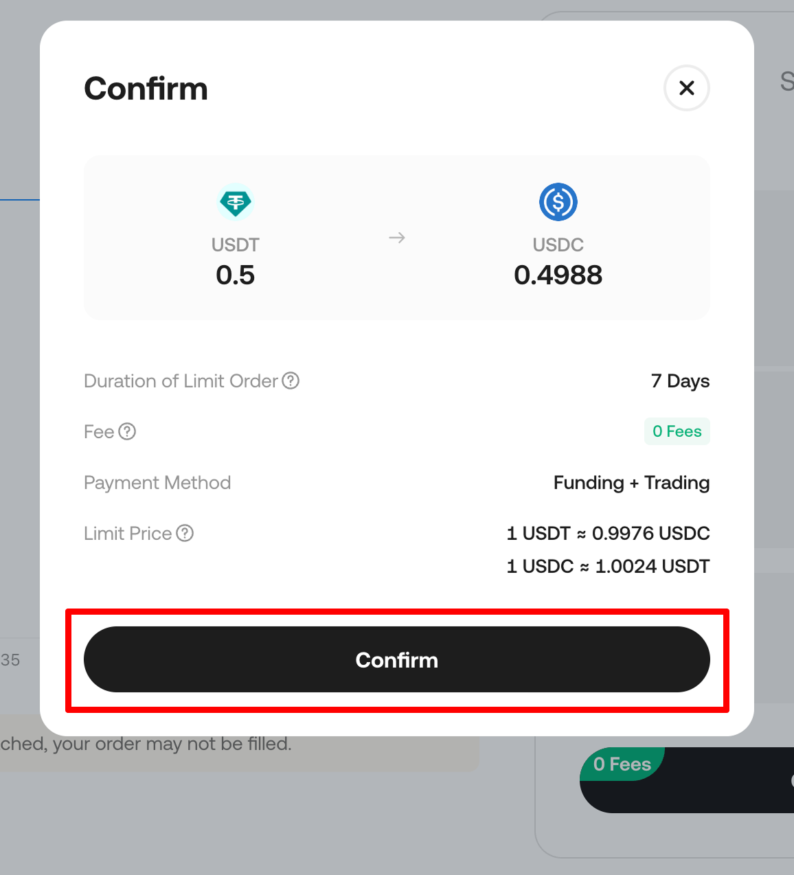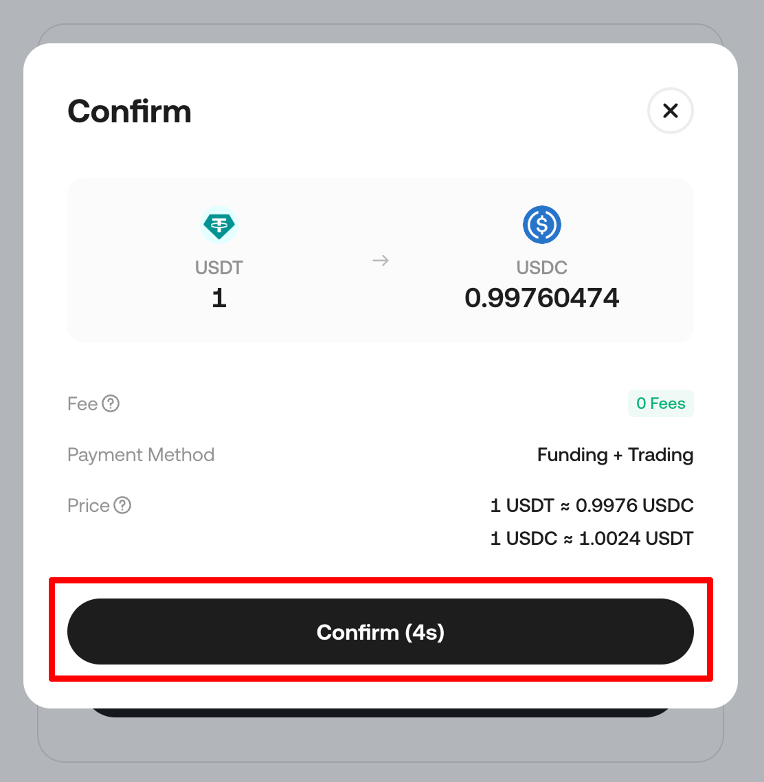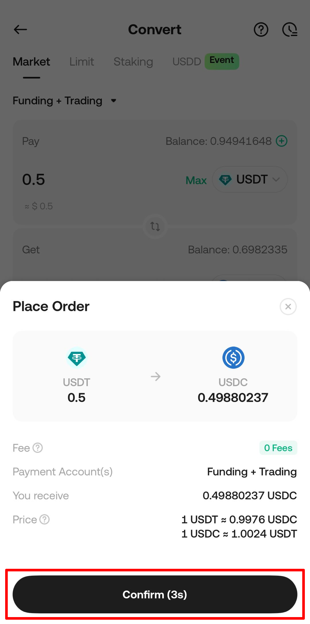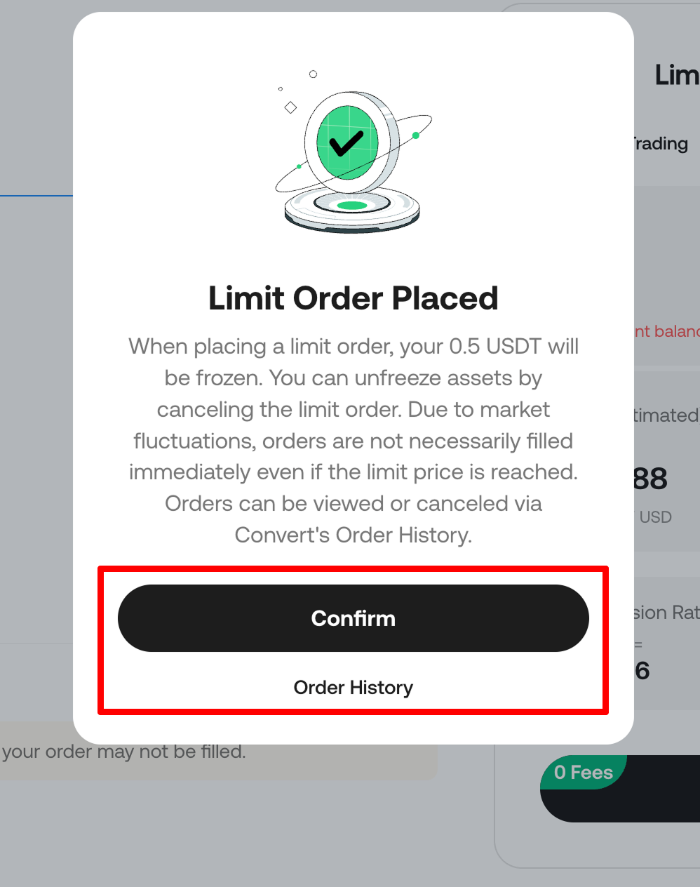 Após clicar em "Converter", você pode revisar os detalhes da ordem (como quantidade e preço) na tela de pré-visualização de Conversão e confirmar a ordem. Por favor, note que o preço cotado está atrelado à última taxa de mercado. Se a cotação expirar, ela será atualizada automaticamente, e a quantidade que você receberá será ajustada de acordo.