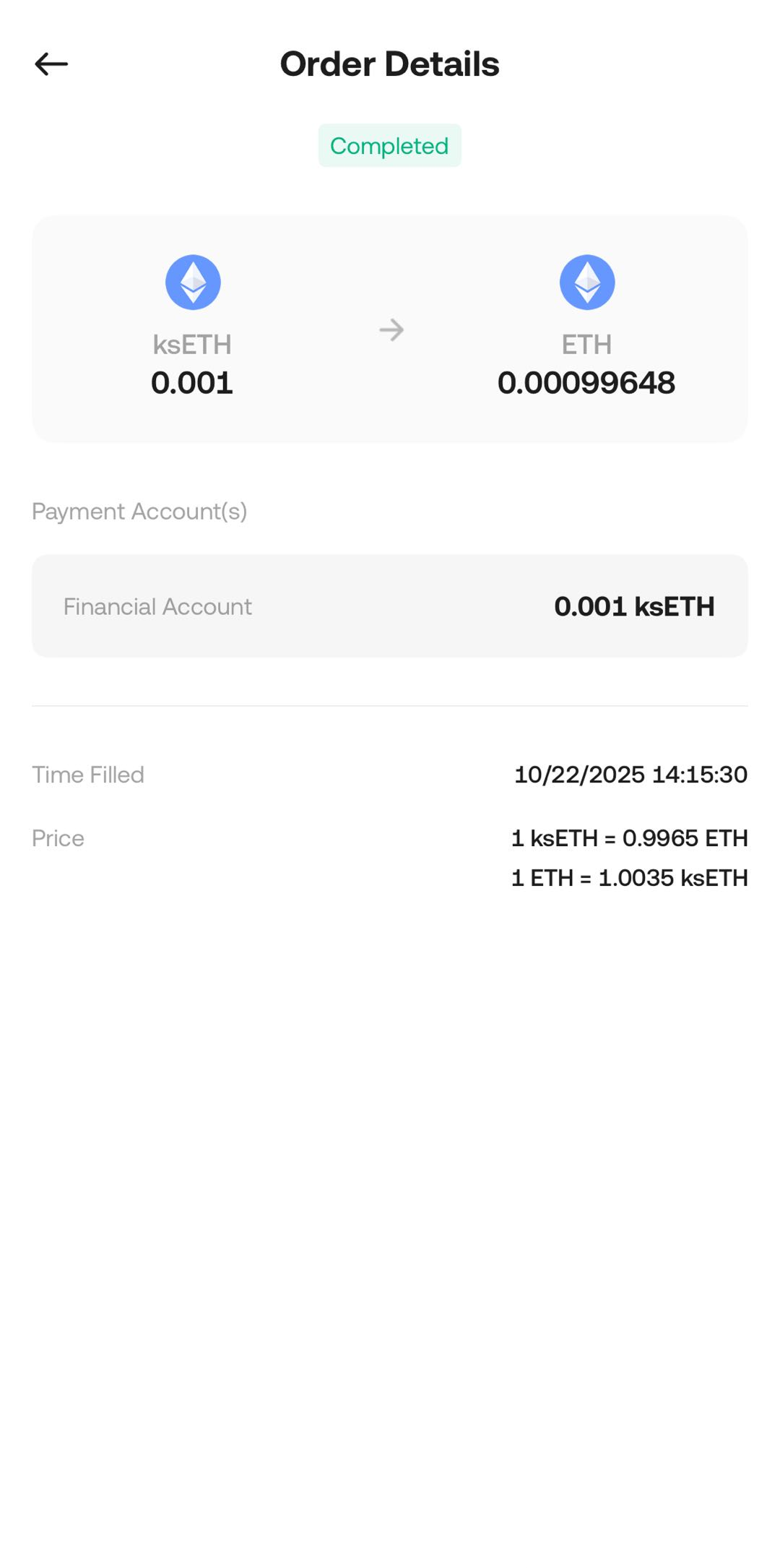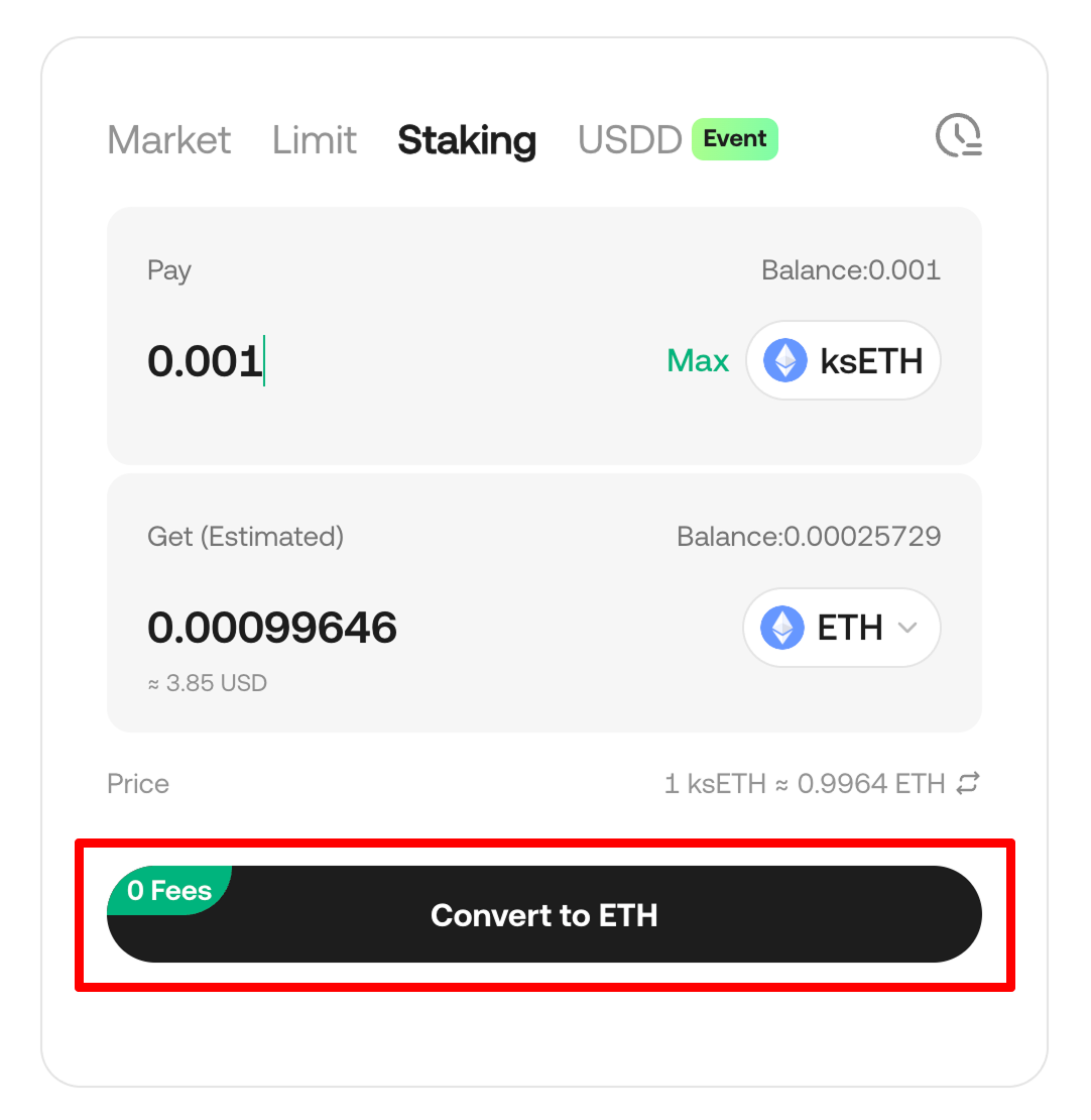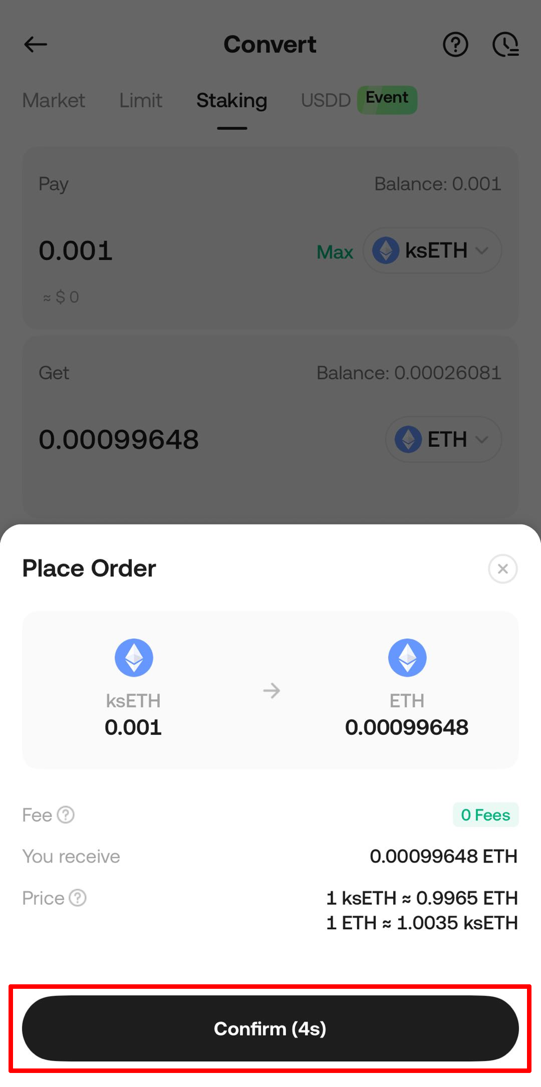 Na aba Staking, selecione o ativo que deseja receber e insira a quantidade que deseja converter. Após clicar em "Converter para ETH", você pode revisar os detalhes da ordem (como quantidade e preço) na tela de pré-visualização de troca rápida e confirmar a ordem. Por favor, note que o preço cotado está atrelado à última taxa de mercado. Se a cotação expirar, ela será atualizada automaticamente, e a quantidade que você receberá será ajustada de acordo. Uma vez que a transação for concluída, clique em "Ver Ordem" para verificar os detalhes.