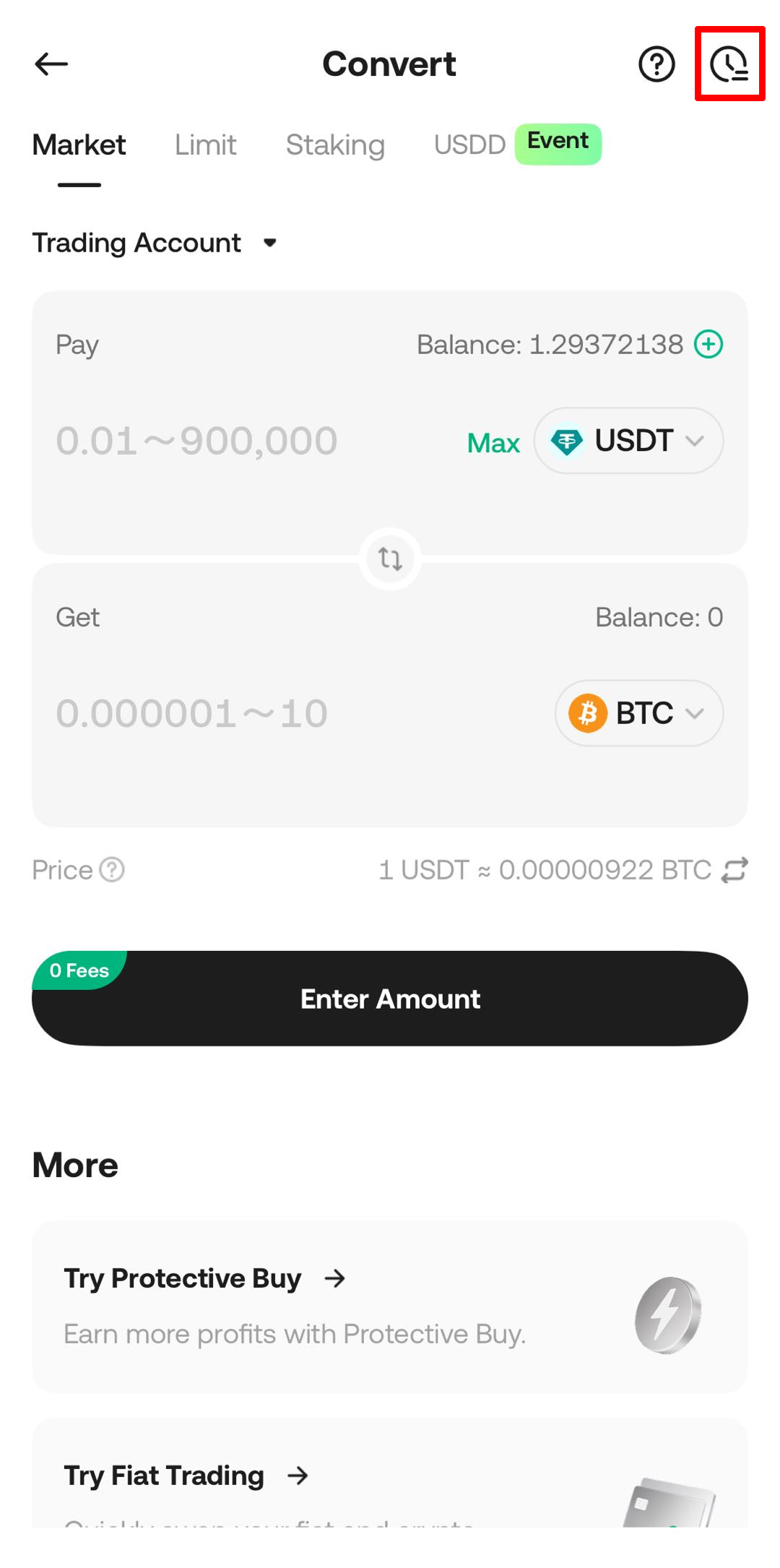 Abra o aplicativo KuCoin, vá para "Negociar" e encontre a aba "Converter" na barra de menu superior.