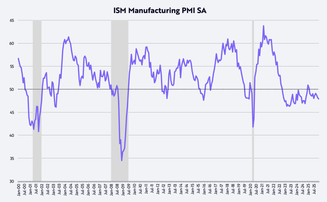 Согласно индексу менеджеров по закупкам (PMI) в США, производственная сфера уже около трех лет подряд находится в состоянии сокращения. В данном диффузному индексе 50 является пороговым значением между расширением и сокращением, как показано на рисунке ниже.