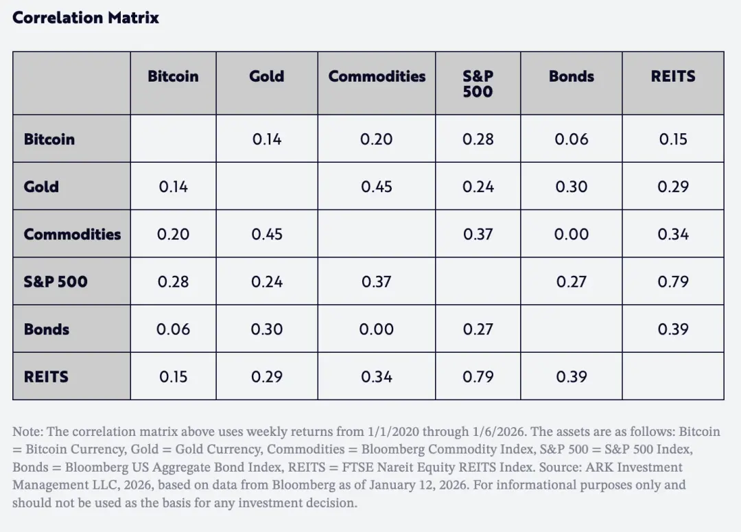 Еще один очень важный фактор для инвесторов заключается в том, что с 2020 года коэффициент корреляции доходности биткойна с золотом и другими основными классами активов был очень низким, как показано в таблице ниже.
