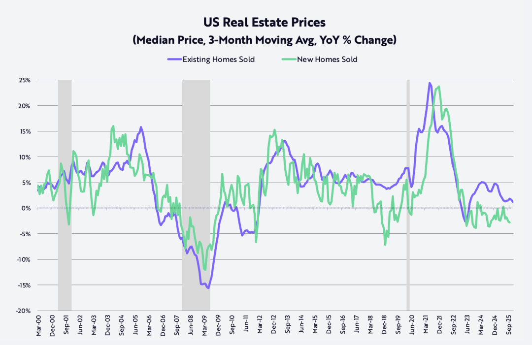 Инфляция цен на готовые дома (рассчитанная как скользящее среднее за три месяца) резко снизилась с пикового уровня в 24% в годовом исчислении сразу после пандемии в июне 2021 года до текущего уровня около 1,3%, как показано на графике ниже.