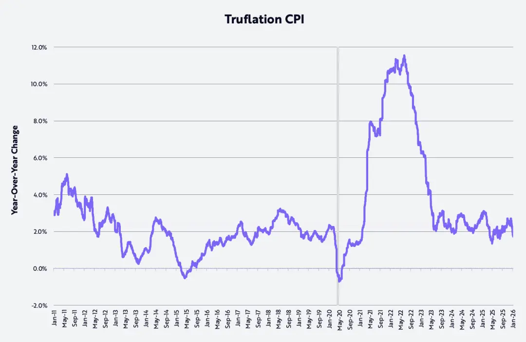 Дополнительное подтверждение этой тенденции к улучшению заключается в том, что недавно темп инфляции, измеренный по индексу Truflation, снизился до 1,7% годовых, как показано на графике ниже, что на почти 100 базисных пунктов (bps) ниже официальных данных об инфляции, основанных на индексе потребительских цен (CPI), которые предоставляет Бюро статистики труда США (BLS).