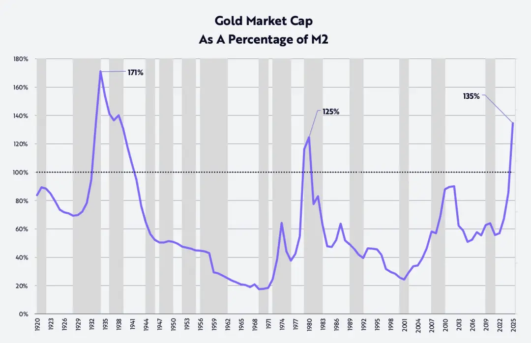 Если оценивать по соотношению рыночной капитализации золота к денежной массе М2, то за последние 125 лет соотношение превышало текущий уровень только в один период - в начале 1930-х годов, во время Великой депрессии, когда цена золота была зафиксирована на уровне 20,67 доллара за тройскую унцию, а денежная масса М2 упала на 30%, как показано на графике ниже.
