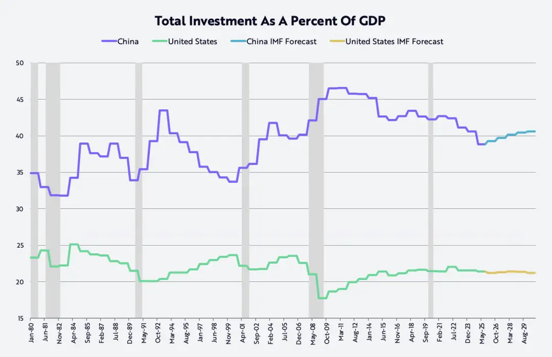 В Китае более высокая производительность труда, соответствующая более высокой оплате труда и более высокой рентабельности, способствует переходу экономической структуры от чрезмерных инвестиций, которые в течение длительного времени в среднем составляли около 40% ВВП, почти в два раза превышая показатель США, к более сбалансированному пути развития (см. график ниже).