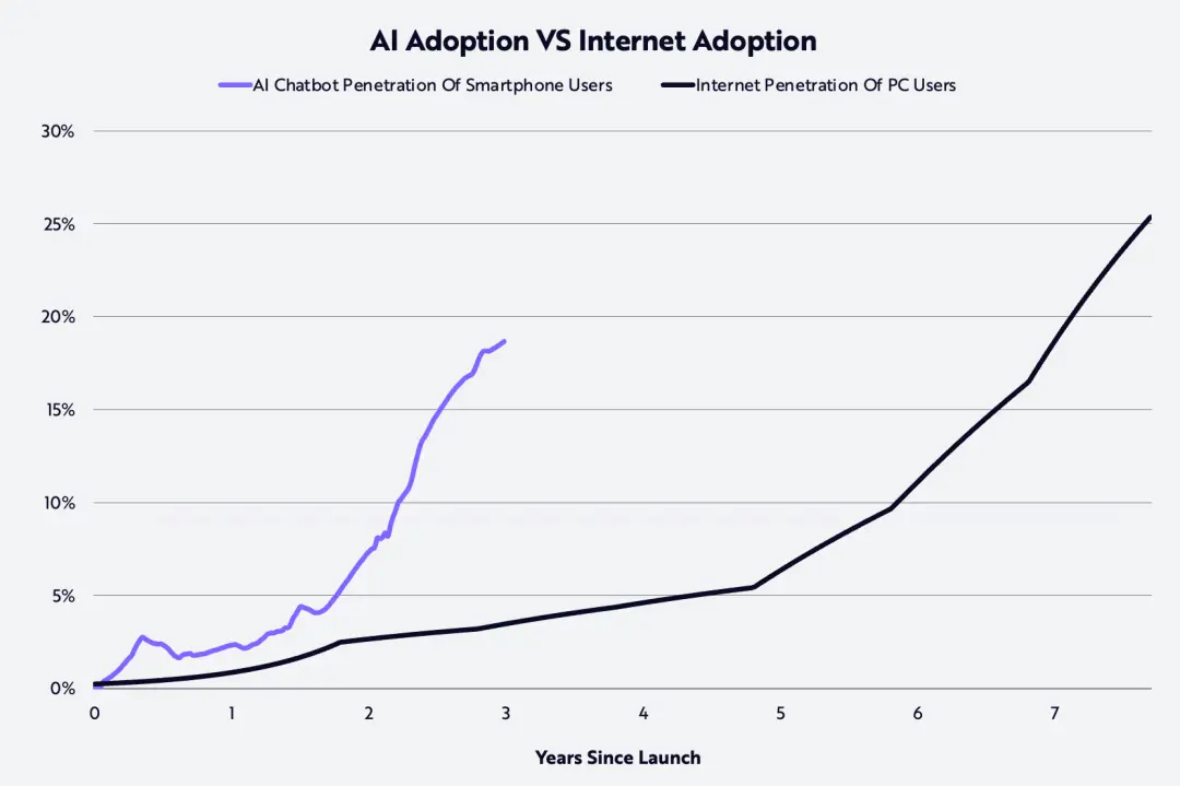 Согласно нашему исследованию, потребители принимают ИИ в два раза быстрее, чем интернет в 90-х годах, как показано на графике ниже.