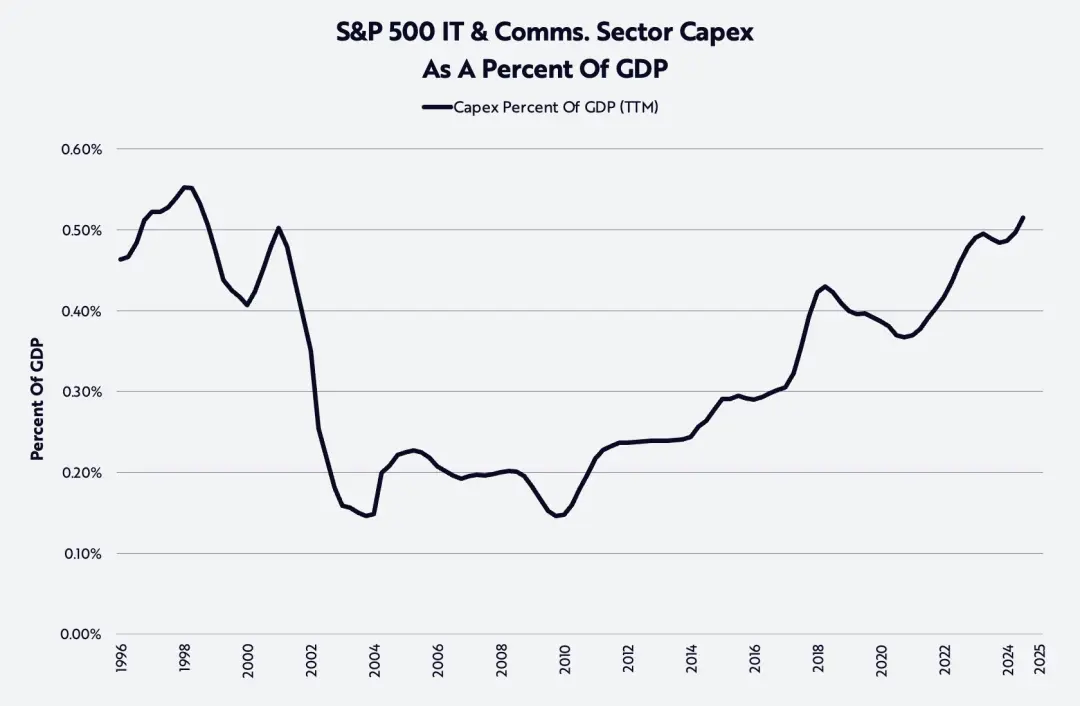 Волна искусственного интеллекта подталкивает капитальные вложения к уровню, не наблюдавшемуся с конца 90-х годов, как показано на графике ниже.