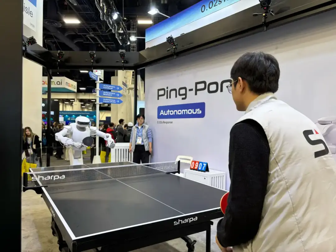На стенде Sharpa внимание привлек автономный робот для игры в настольный теннис. Его ключевая особенность — невероятная скорость отклика в 0,02 секунды. Это значит, что задержка между визуальным восприятием и движением манипулятора практически сведена к нулю, что выходит за пределы физических возможностей человеческого рефлекса.