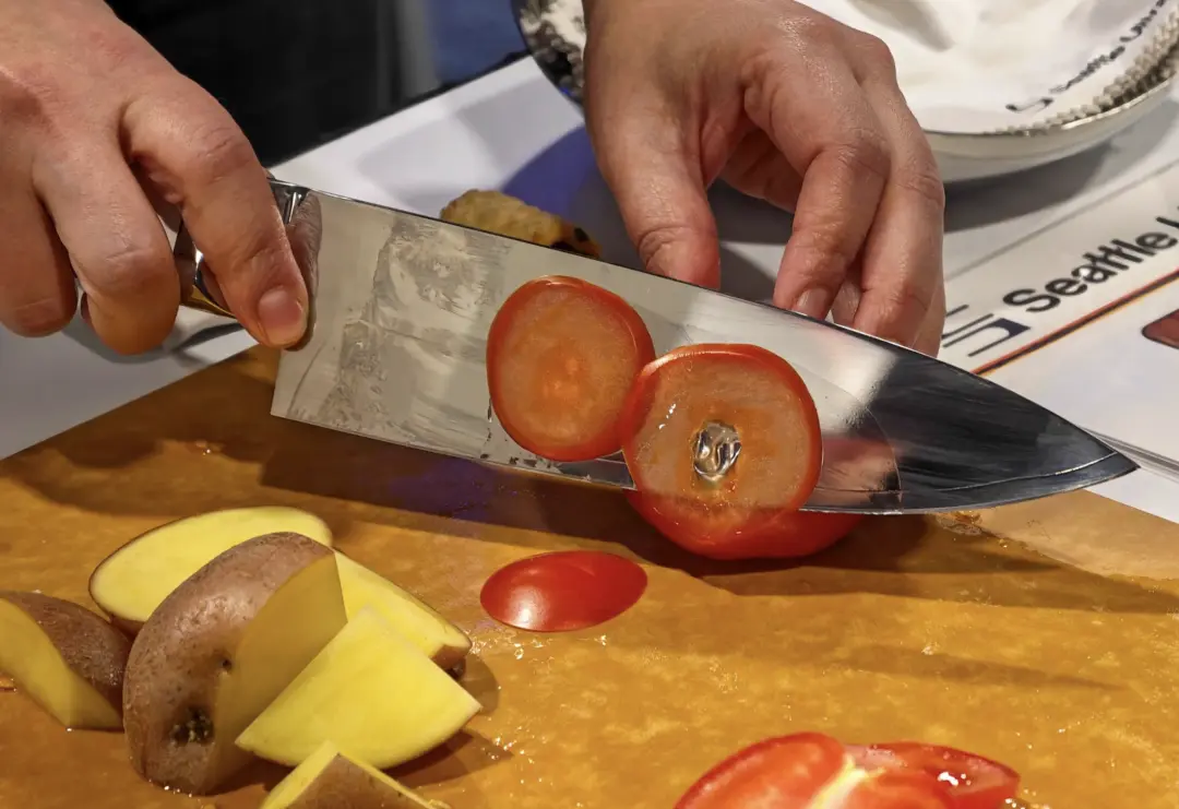 На CES я обнаружил инструмент, который мгновенно превращает любого любителя готовить в профессионального шеф-повара, — ультразвуковой нож C-200 от компании Seattle Ultrasonic. Уже само название звучит очень технологично, но использовать его — это еще более удивительное ощущение, которое кажется противоречащим законам физики. С виду это обычный шеф-нож длиной 8 дюймов, выполненный из японской стали AUS-10. Даже без активации ультразвуковой функции он остается ножом высочайшего качества с высокой твердостью. Однако, стоило мне нажать оранжевую кнопку на рукоятке, и хоть визуально лезвие не двигалось, а шум был незаметен, благодаря встроенному пьезокерамическому кристаллу нож вибрировал более 30,000 раз в секунду, превращаясь на микроскопическом уровне в настоящую «машину для резки».