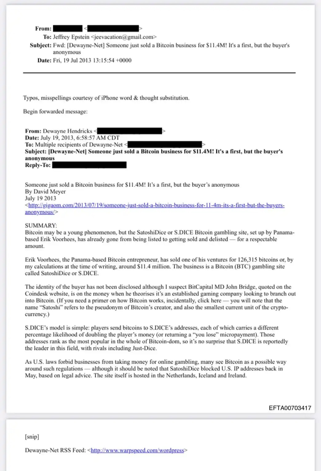 Еще одно письмо показывает, что Эпштейн участвовал в первоначальном финансировании инфраструктурной компании Bitcoin Blockstream, которая получила 18 миллионов долларов США, инвестиции Эпштейна выросли с 50 до 500 тысяч долларов США.