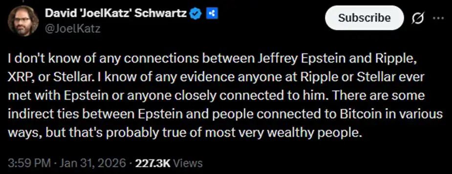 Может ли это означать, что зловещие дела Эпштейна существуют и в криптовалютной сфере? Дэвид Шварц также отметил, что для большинства сверхбогатых людей связь с биткойном может быть очень распространенной.