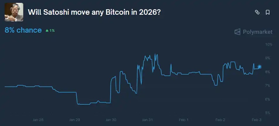 После раскрытия последней партии документов об Эпштейне на прогнозном рынке Polymarket вероятность того, что адрес Биткойна Сатоши Накамото будет активирован в 2026 году, подскочила с около 6% до 9,3%, а затем стабилизировалась на уровне 8%.