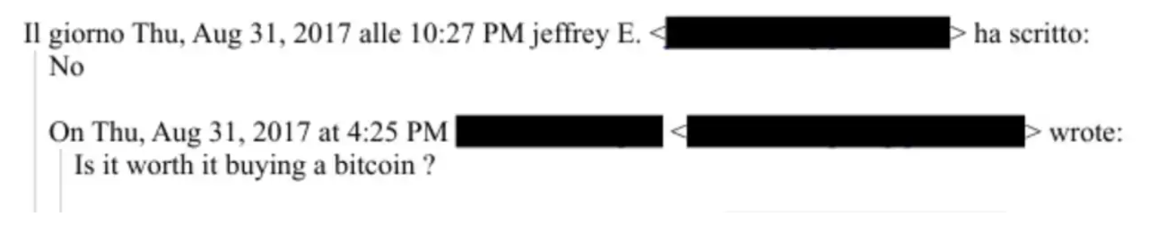 Если Эпштейн действительно встречался с Сатоши Накамото, то, похоже, Сатоши не смог убедить Эпштейна в преимуществах биткойна во время их контакта. В переписке 31 августа 2017 года Эпштейн ответил на вопрос о том, стоит ли покупать биткойн, коротко ответив: «Нет». В то время один биткойн стоил меньше 5000 долларов.