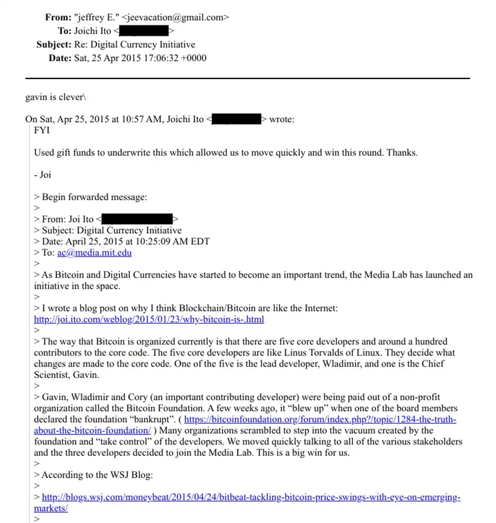 В то время скандал еще не был раскрыт, и общественность не знала об анонимном пожертвовании Эпштейна на Медиалабораторию Массачусетского технологического института. Джой Ито выразил благодарность Эпштейну по электронной почте, объяснив ему, как разрабатывается и работает Bitcoin, и добавив, что благодаря этим деньгам лаборатория «могла быстро действовать и добиться больших успехов», потому что «многие организации хотели бы воспользоваться ситуацией, чтобы взять под контроль разработчиков Bitcoin».
