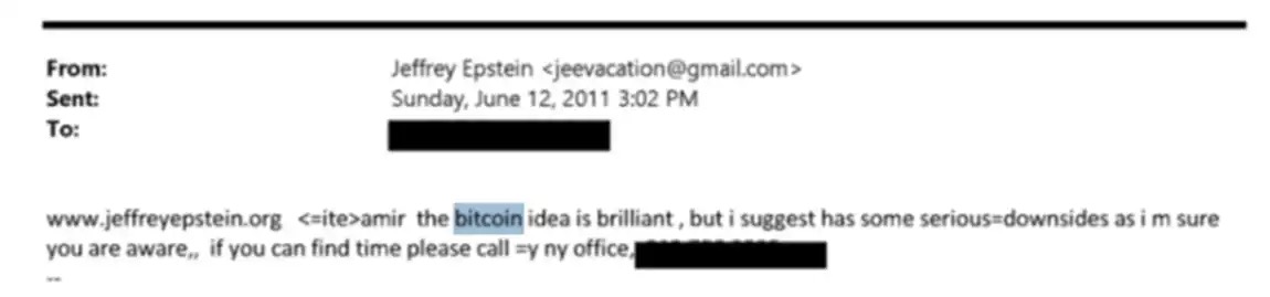Дата следующего электронного письма — 12 июня 2011 года, что приходится на период около пика цены биткойна в этом году. В письме Эпштейн заявил: «Биткойн — это блестящая идея, но у нее есть и серьезные недостатки».