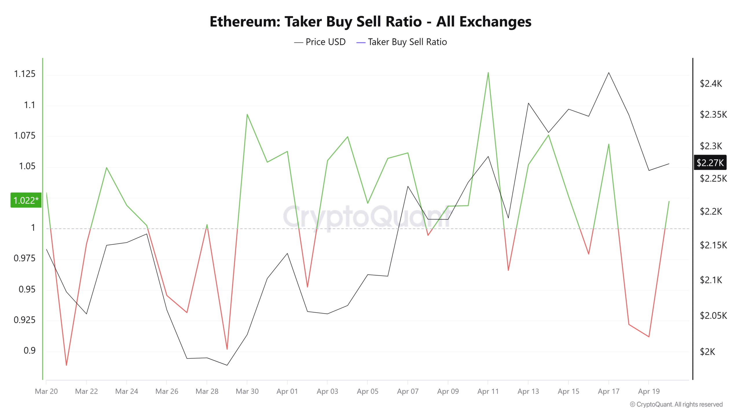 После того как рынок достиг уровня $2,4 тыс., трейдеры на рынке деривативов начали фиксировать прибыль. В результате соотношение покупок и продаж тейкеров упало ниже 1, достигнув трехнедельного минимума в 0,9.