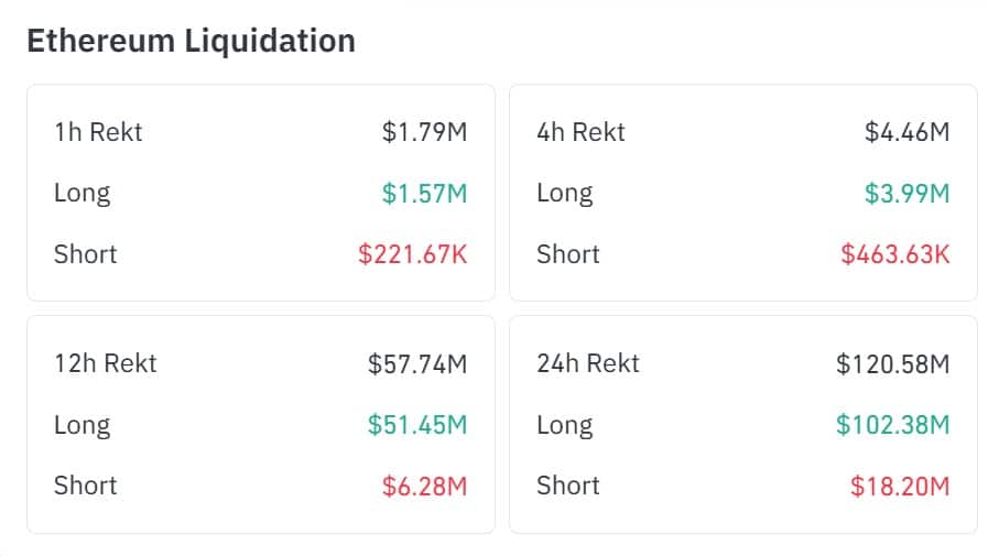 На фоне коррекции рынка уровни ликвидации как для длинных, так и для коротких позиций резко выросли. Данные CoinGlass показали, что было ликвидировано позиций на $120 млн, из них $102 млн — длинные позиции.