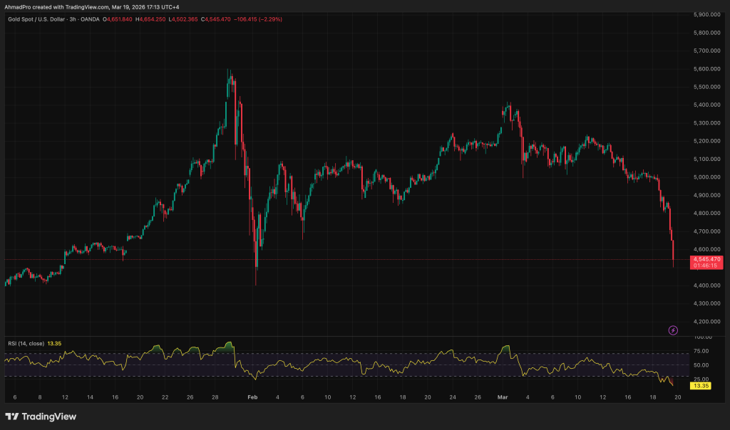 Золото сейчас торгуется около $4 500. Технически перепродано, но отскоковой тени пока не видно. Медведи по-прежнему в контроле.
