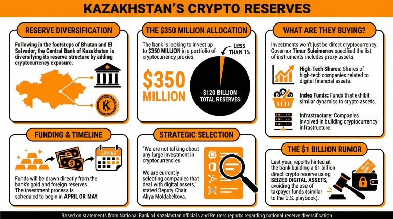 Центральный банк Казахстана недавно объявил, что создаст инвестиционный портфель объемом до 350 миллионов долларов США для инвестиций в компании криптовалюты и другие инструменты, обеспечивающие экспозицию к цифровым активам, используя для этого золото и часть своих валютных резервов.