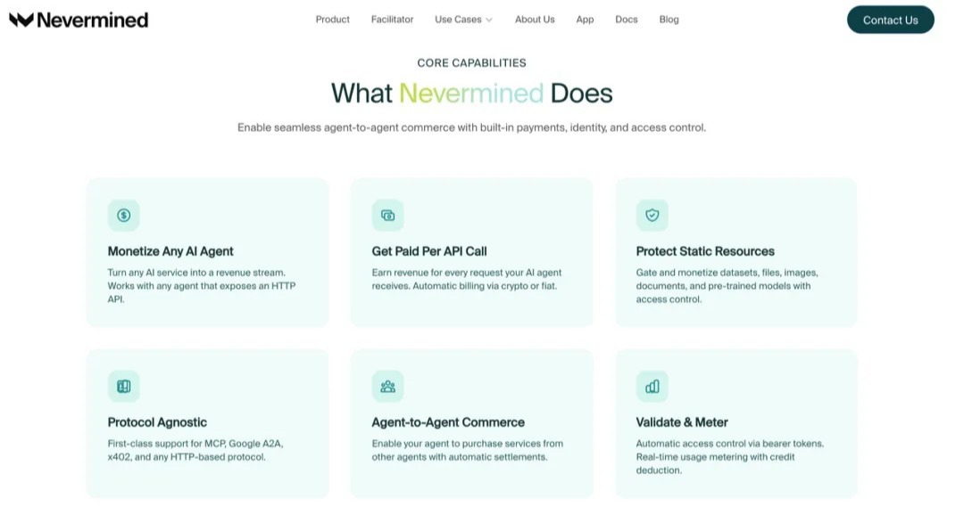 На примере Nevermined: он создает не просто инструмент для одноразовых платежей, а инфраструктуру, позволяющую ценообразовать, взимать плату и производить расчеты за услуги ИИ. Его возможности включают биллинг, контроль доступа, мгновенные расчеты и совместимость с протоколами агентов, такими как MCP, A2A, x402, AP2. Его истинная цель — не "как оплатить", а "как превратить выполнение задачи ИИ в немедленный доход".