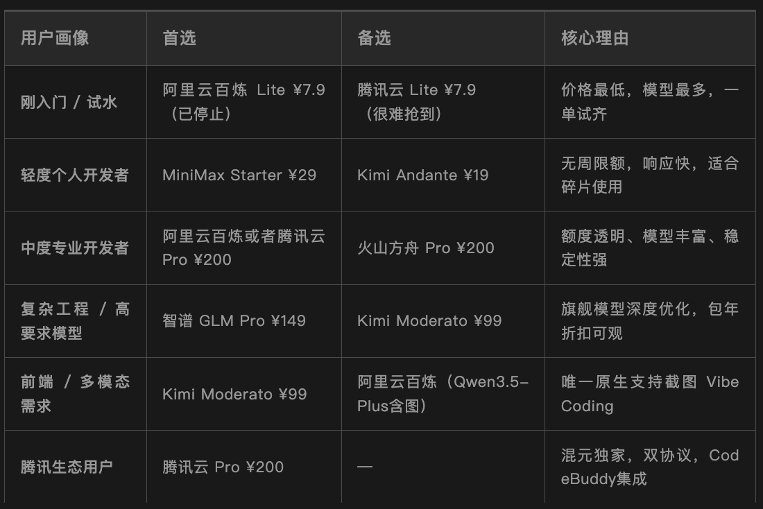 Ежедневная непрерывная разработка более 6 часов требует обработки крупных кодовых баз и сложных рабочих процессов агентов. Месячный лимит в 90 000 запросов и лимит в 6 000 запросов за 5-часовой интервал от Tencent/Bailian Pro представляет собой оптимальное сочетание соотношения цены и качества и стабильности на облачных платформах.