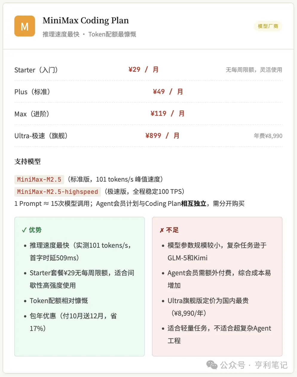 В отличие от «модельного супермаркета» облачных провайдеров, модельный план от производителя следует подходу «специализированного магазина»: предлагает только собственные модели, но с глубокой оптимизацией, более точной настройкой возможностей модели и лимитов. Такие пакеты обычно используют «Prompts» в качестве единицы измерения: 1 Prompt ≈ 15 вызовов модели (по оценке MiniMax), поэтому цифры кажутся намного меньше, но каждый вызов поддерживает больше диалогов.