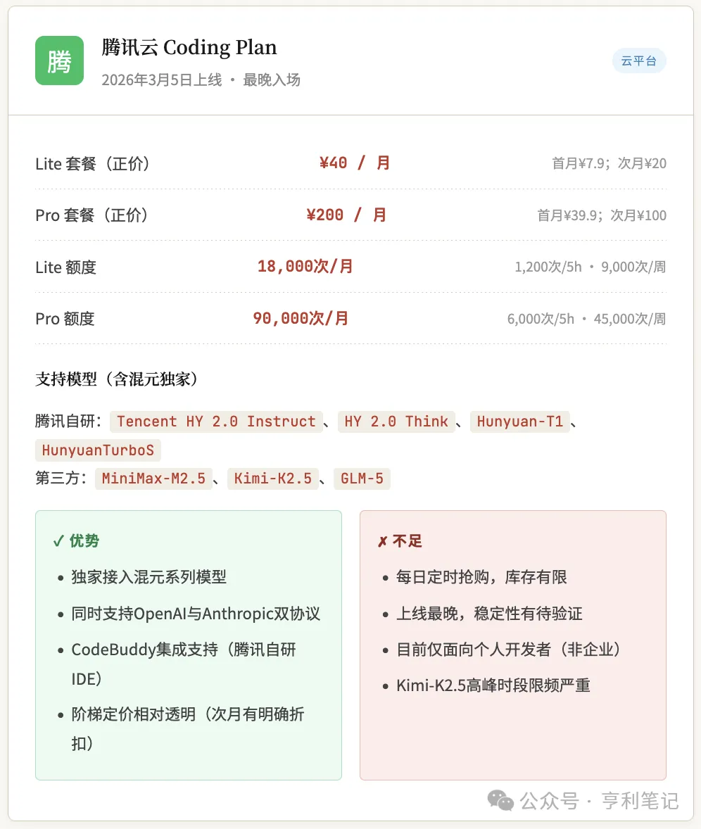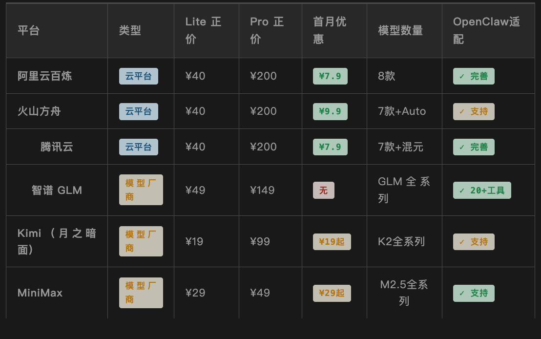Первый раз сталкиваюсь с Coding Plan и хочу максимально дешево протестировать полный цикл OpenClaw. Разнообразие моделей Bailian (8 моделей) позволяет в рамках одного тарифа попробовать Qwen, GLM-5 и Kimi, что помогает быстро сформировать интуитивное представление. Сейчас у Alibaba Cloud доступен только тариф Pro по 200 юаней в месяц, а у Tencent Cloud еще есть Lite-тарифы по 7,9 и 40 юаней, однако реальные пользователи отмечают, что их ресурсы раскупаются мгновенно, и, вероятно, проще всего получить тариф за 200 юаней в месяц.