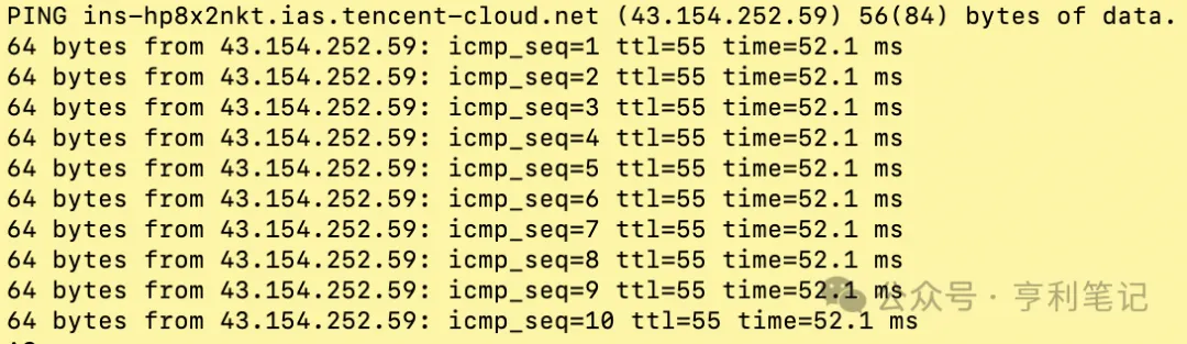 Например, это проверка сетевого соединения между хостом OpenClaw и точкой доступа Tencent Cloud; обратите внимание, есть ли потери пакетов в icmp_seq и низкая ли задержка time: